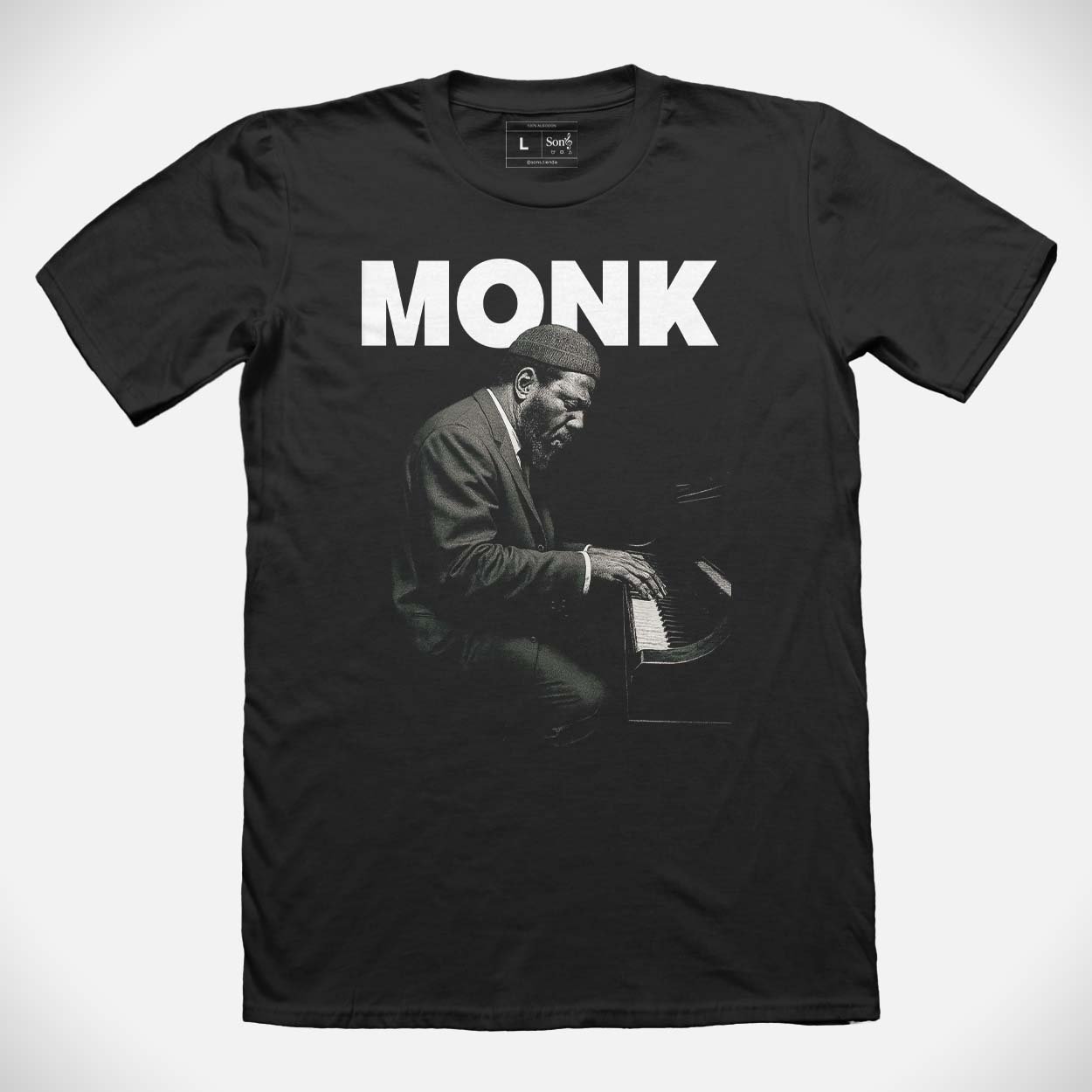 Rompé moldes como Thelonious Monk con esta remera negra de algodón premium. Un diseño único que presenta su figura inconfundible al piano y su nombre en mayúsculas impactantes. Vestí la esencia del genio con más swing del siglo XX.